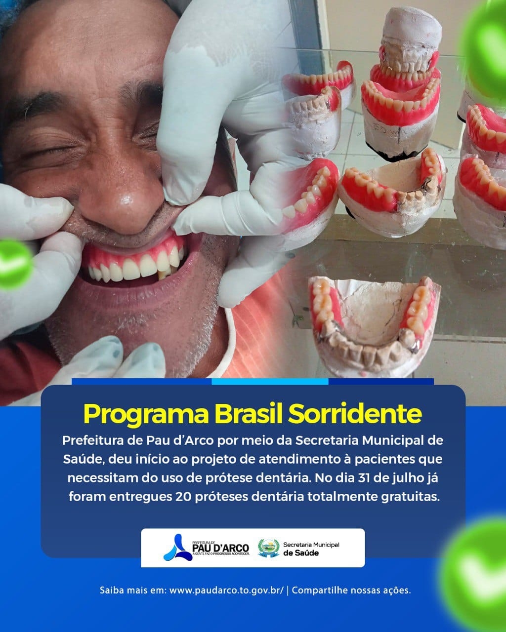 Pensando no cuidado e na promoção da saúde primária, a Prefeitura de Pau d’Arco Tocantins por meio da Secretaria Municipal de Saúde, deu início ao projeto de atendimento à pacientes que necessitam do uso de prótese dentária. Na última de julho já foram entregues 20 Próteses Dentária totalmente gratuitas.
